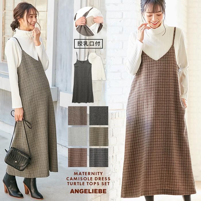 マタニティ 服 ワンピース 親子コーデ 授乳口付 セット グレンチェックキャミワンピ タートルトップスセット 妊婦服 授乳服 Angeliebe 通販 Yahoo ショッピング